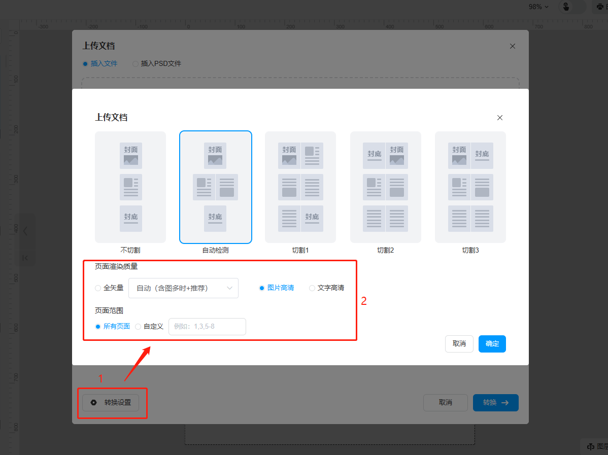 b)點擊【轉(zhuǎn)換設置】,根據(jù)你的需要,勾選頁面分割模式以及頁面渲染質(zhì)量,設置頁面范圍,點擊【確認】。如果你上傳的文檔是雙頁的,可以在上傳之前選擇切割方式后再上傳文檔,在上傳界面點擊轉(zhuǎn)換設置,會彈出四種切割方式,根據(jù)你的文檔排版風格來選擇用哪種切割方式。
