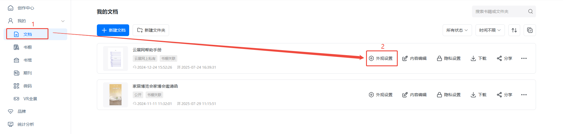 點擊【文檔】,然后點擊對應(yīng)電子書的【外觀設(shè)置】,進入編輯器界面。