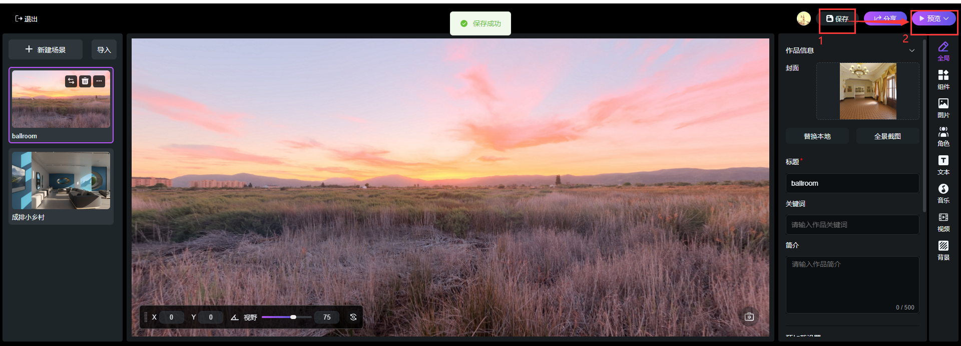 在頁面右側(cè)可設(shè)置組件、圖片、角色、文本、音樂、視頻等多種交互元素,滿足客戶的不同使用需求,同時(shí)可引導(dǎo)觀眾探索,增強(qiáng)故事敘述,使得虛擬體驗(yàn)更加生動(dòng)和有趣。