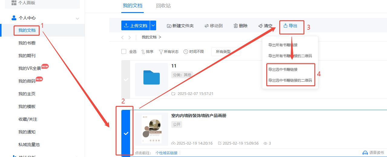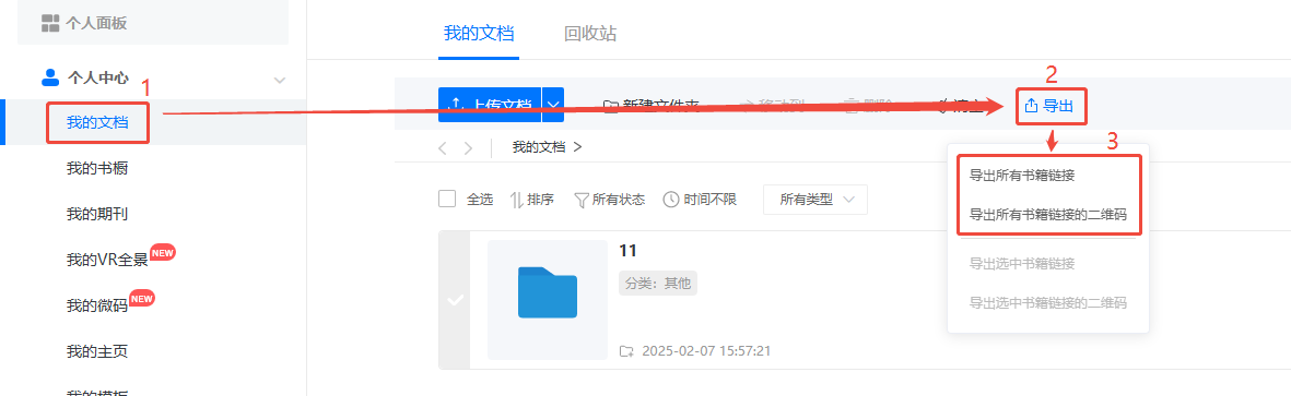 點(diǎn)擊【我的文檔】,勾選需要導(dǎo)出的書籍,點(diǎn)擊【導(dǎo)出】后,選擇導(dǎo)出選中書籍的鏈接或者二維碼,導(dǎo)出鏈接會(huì)得到一份excel表格,表格會(huì)顯示每一本電子書的標(biāo)題、描述、鏈接以及創(chuàng)建時(shí)間,導(dǎo)出二維碼會(huì)得到一份壓縮包,解壓之后即可查看所選書籍的二維碼。