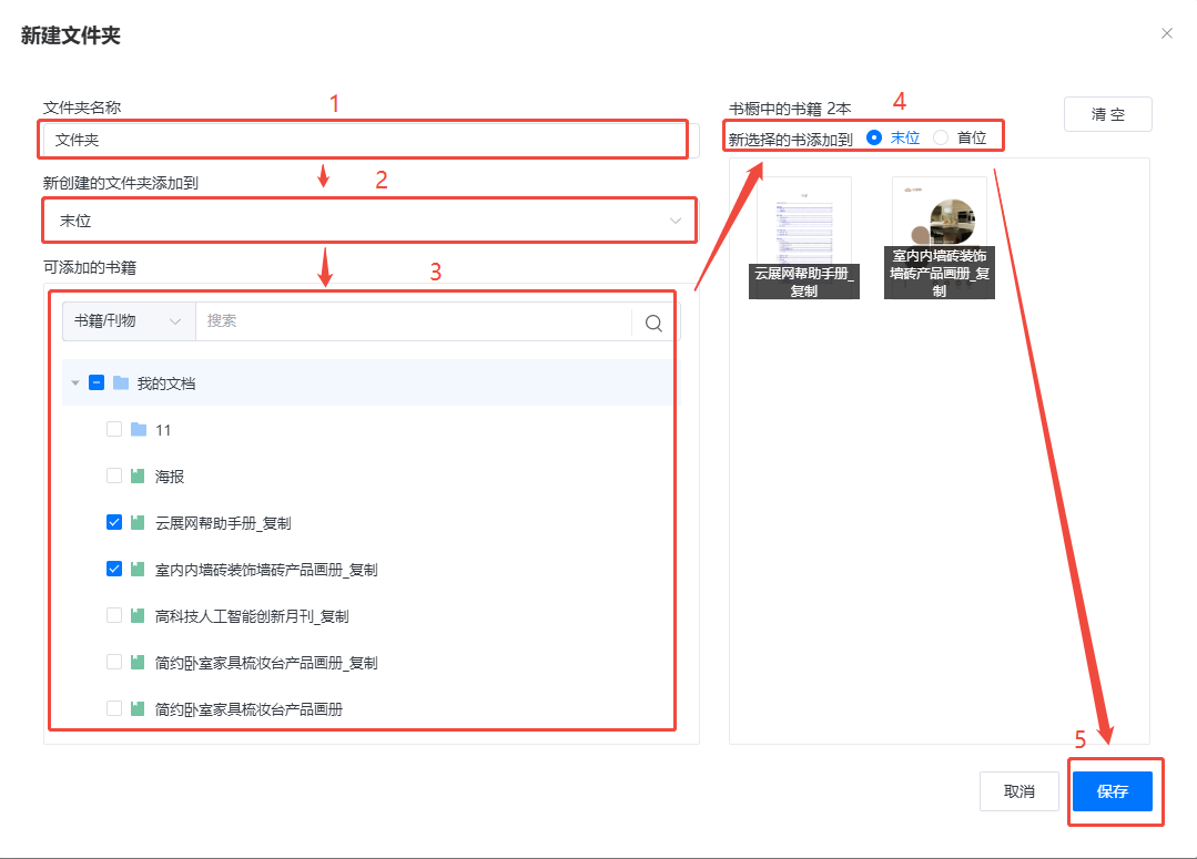 輸入文件夾名稱,設(shè)置新創(chuàng)建的文件夾需要添加到的位置,然后從文檔或者期刊中選擇書籍,最后設(shè)置新選擇的書本需要添加到的位置,點擊保存。