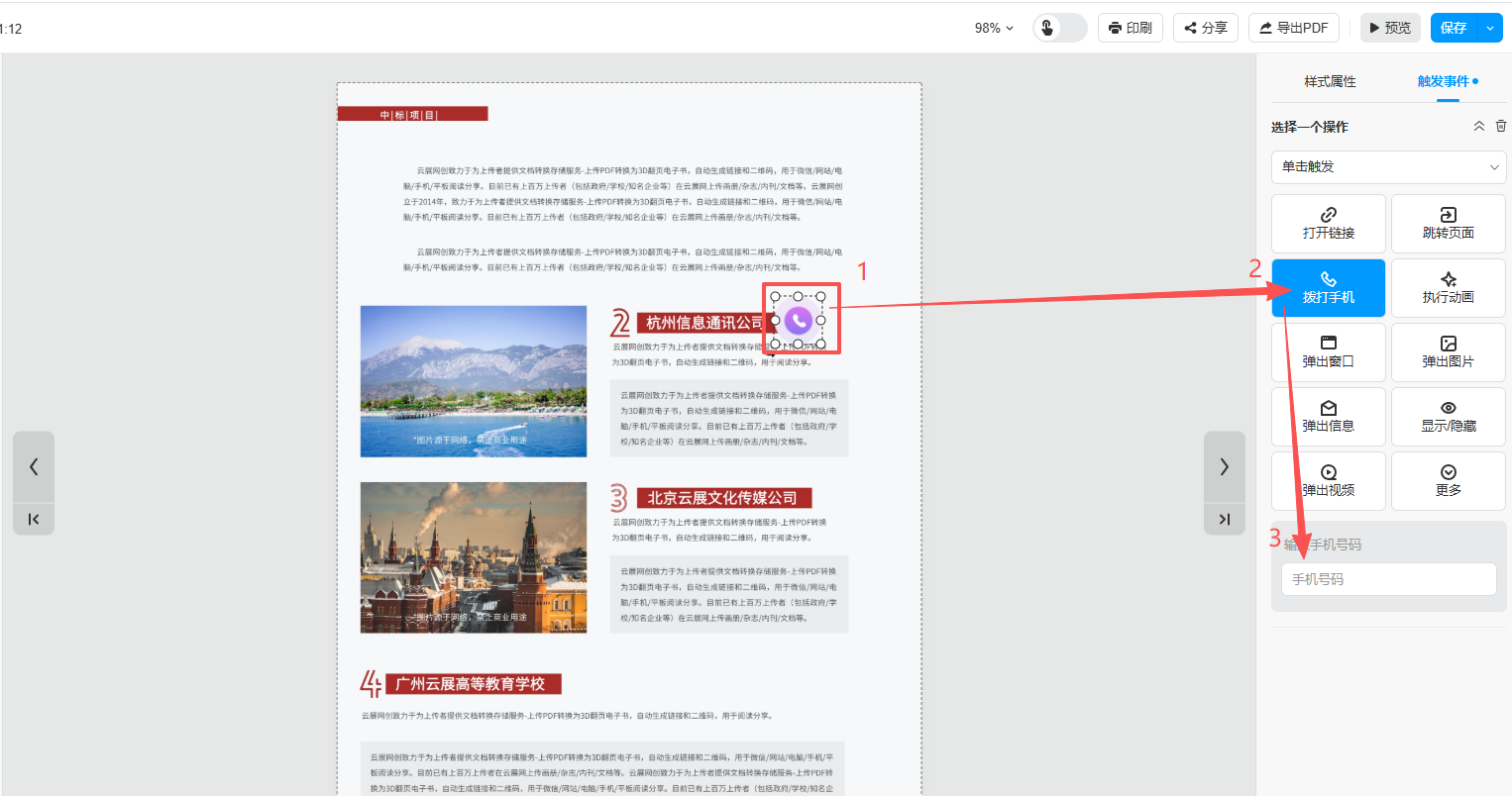 這個(gè)功能主要是為了方便讀者聯(lián)系制作者,制作者可以在書本頁(yè)面添加電話按鈕并設(shè)置電話號(hào)碼,點(diǎn)擊電話按鈕可以直接撥打電話。