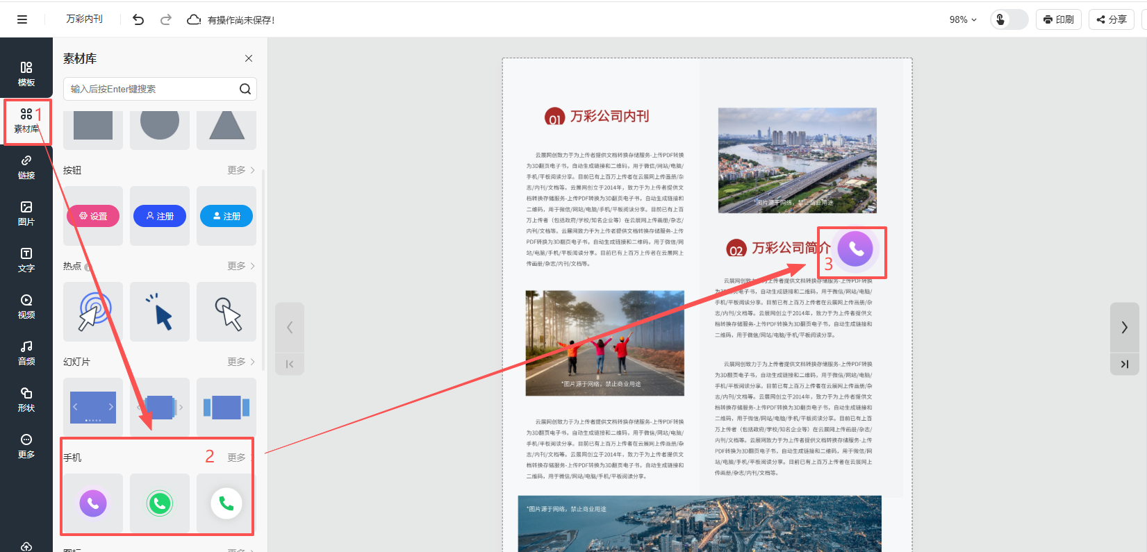 點(diǎn)擊【素材庫(kù)】,點(diǎn)擊【手機(jī)】,然后選擇電話按鈕樣式,就會(huì)有一個(gè)電話按鈕出現(xiàn)在頁(yè)面上。