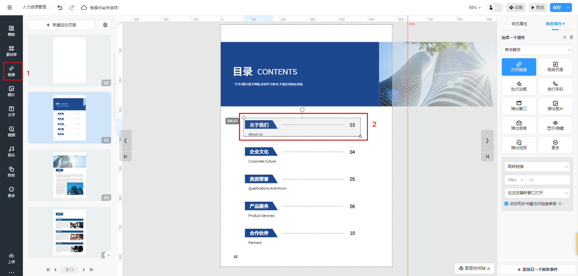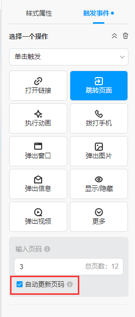 打開【觸發(fā)事件】,【跳轉(zhuǎn)頁面】,設(shè)置需要跳轉(zhuǎn)的頁碼(頁碼從第一頁開始計(jì)算)。