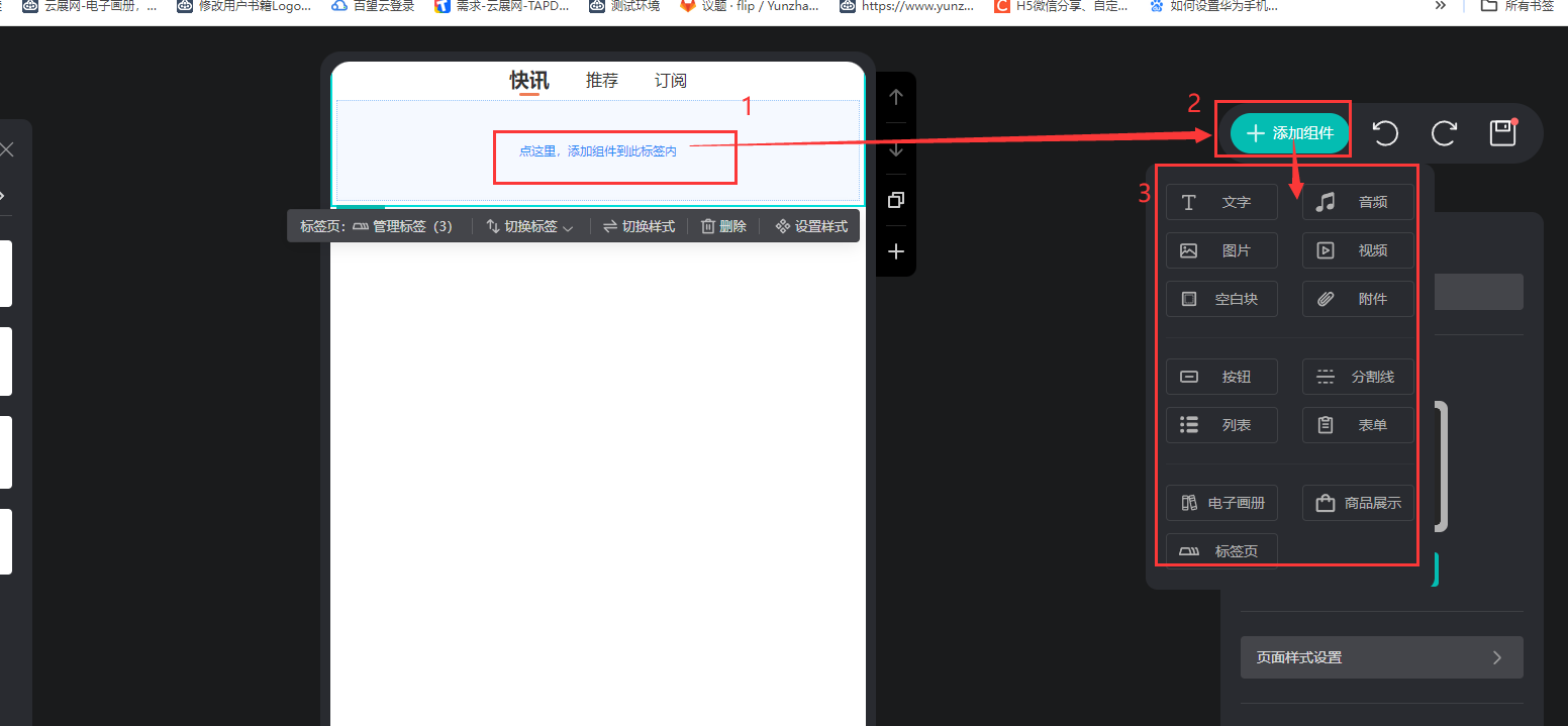 點擊【標(biāo)簽頁內(nèi)】,點擊【添加組件】,可以添加文字,圖片,音視頻,按鈕,表單等內(nèi)容在標(biāo)簽頁上。
