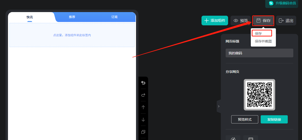 點擊【添加組件】,點擊【標(biāo)簽頁】,在左邊選擇標(biāo)簽樣式添加到微碼上。