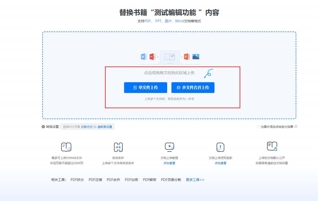 如果之前上傳的是單文件,點擊【單文件上傳】或者【多文件合并上傳】直接上傳修改好的新文件即可。