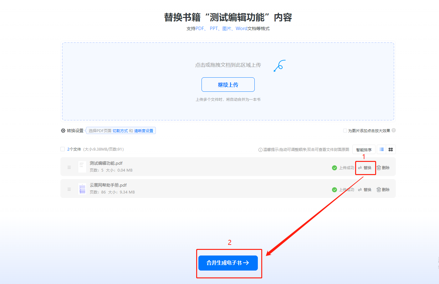 如果之前上傳的是多個文件,點擊替換,把舊文件替換成新文件,然后點擊【合并生成電子書】。