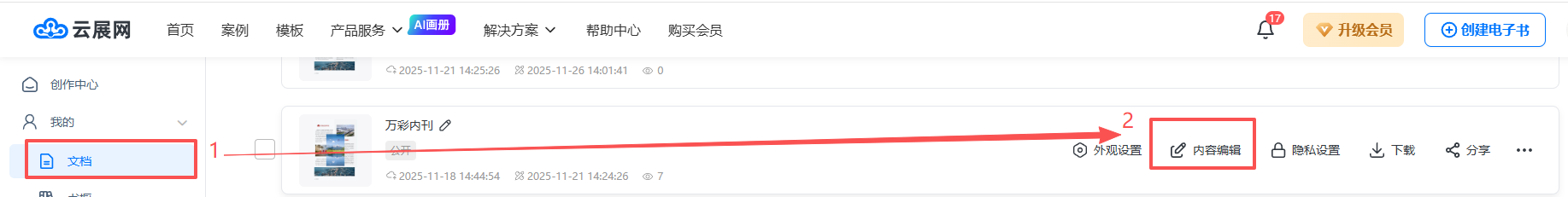 在【文檔】頁面,找到需要編輯的書,點(diǎn)擊【內(nèi)容編輯】。