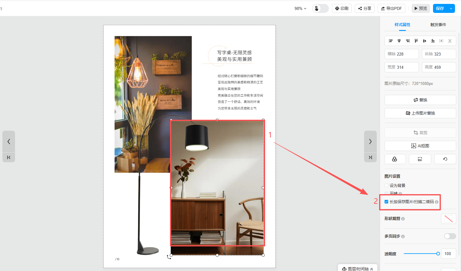 選中插在頁面上產(chǎn)品圖,打開【長(zhǎng)按保存圖片/掃描二維碼】。